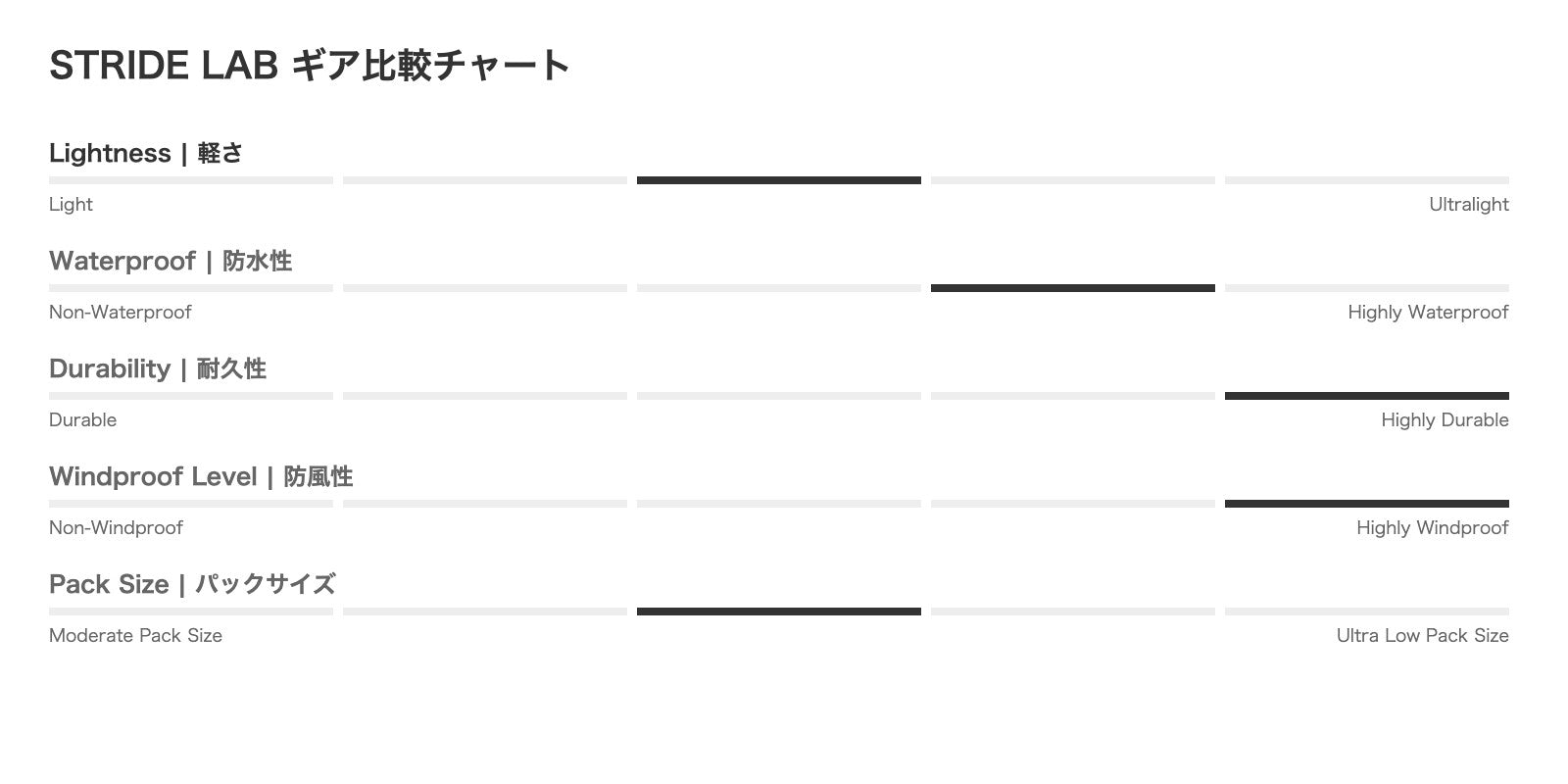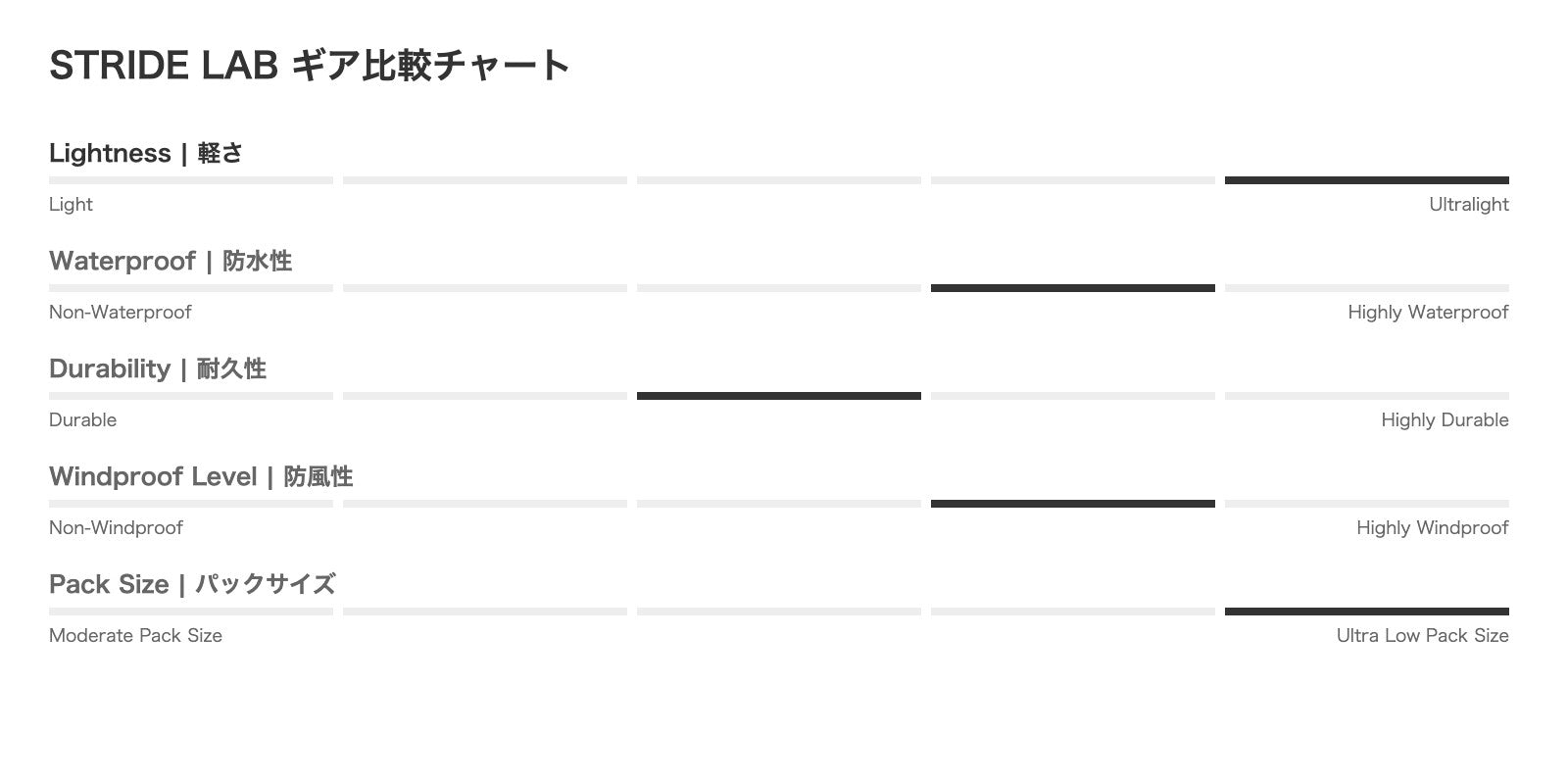 ポケットやシームテープを省き、とにかく軽さと機動性を重視したミニマルな設計。そのため、数時間程度の雨風には対応できますが、強い雨風の中での長時間使用にはあまり向いていません。
